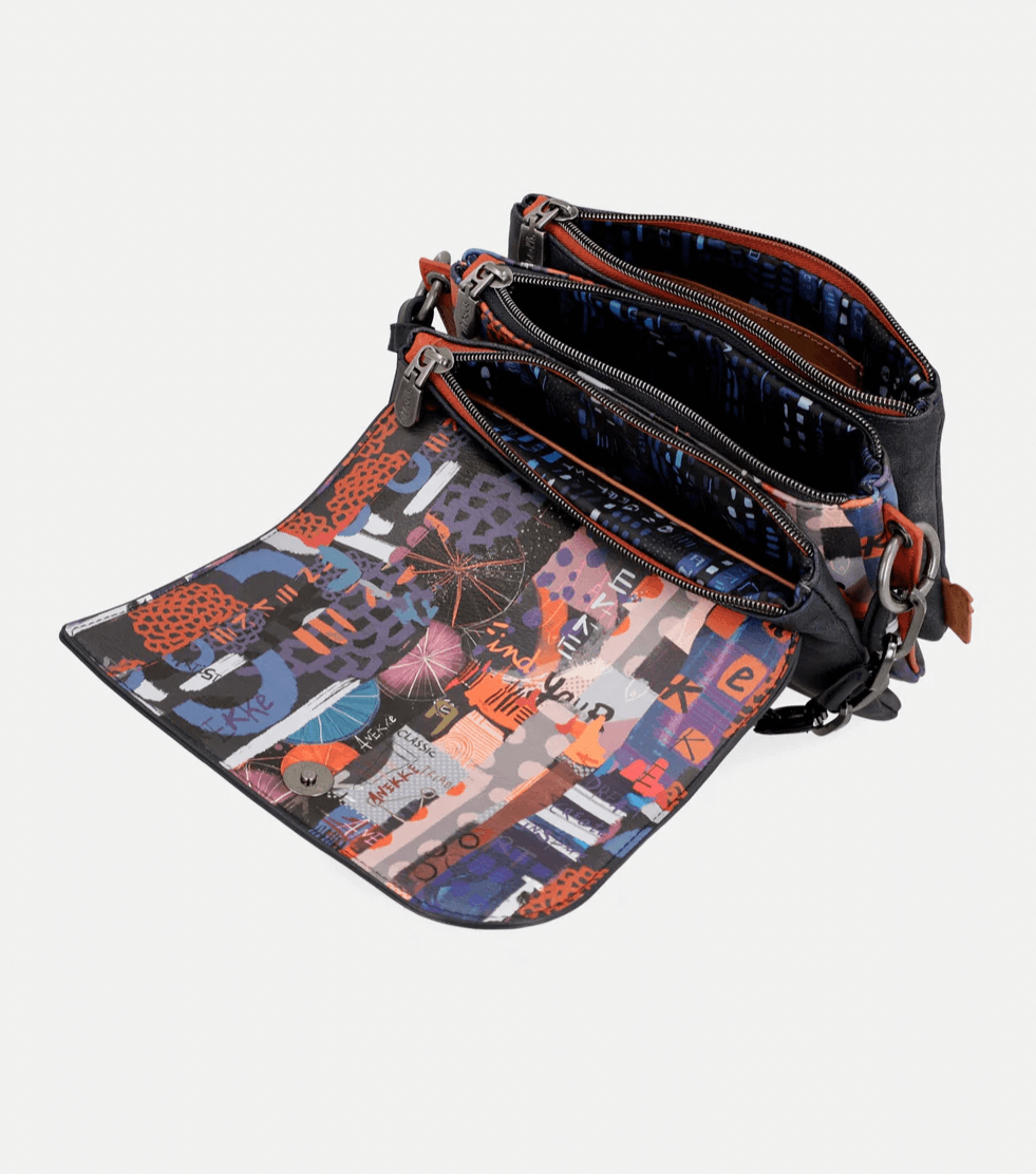El original diseño en el frontal y la parte trasera de este bolso bandolera combina estampados, con tonos azules y rojizos.